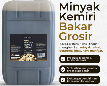 Kami menawarkan pembelian grosir minyak kemiri, baik bakar maupun murni, untuk memenuhi kebutuhan bisnis Anda dengan harga yang kompetitif dan kualitas terjamin.